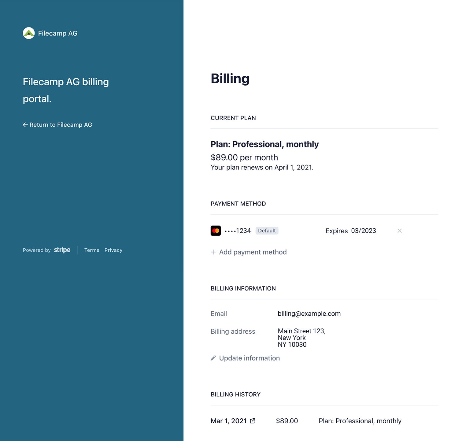 Filecamp only stores the absolute minimum card details such as the last four digits and the expiration date for identification purposes.
